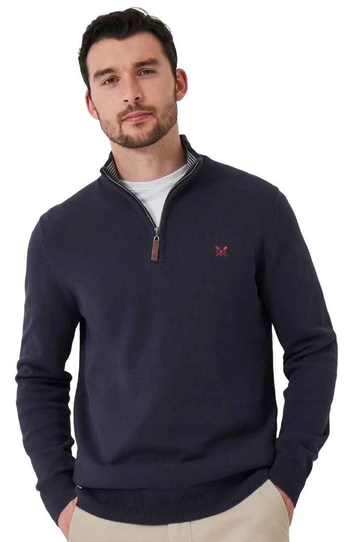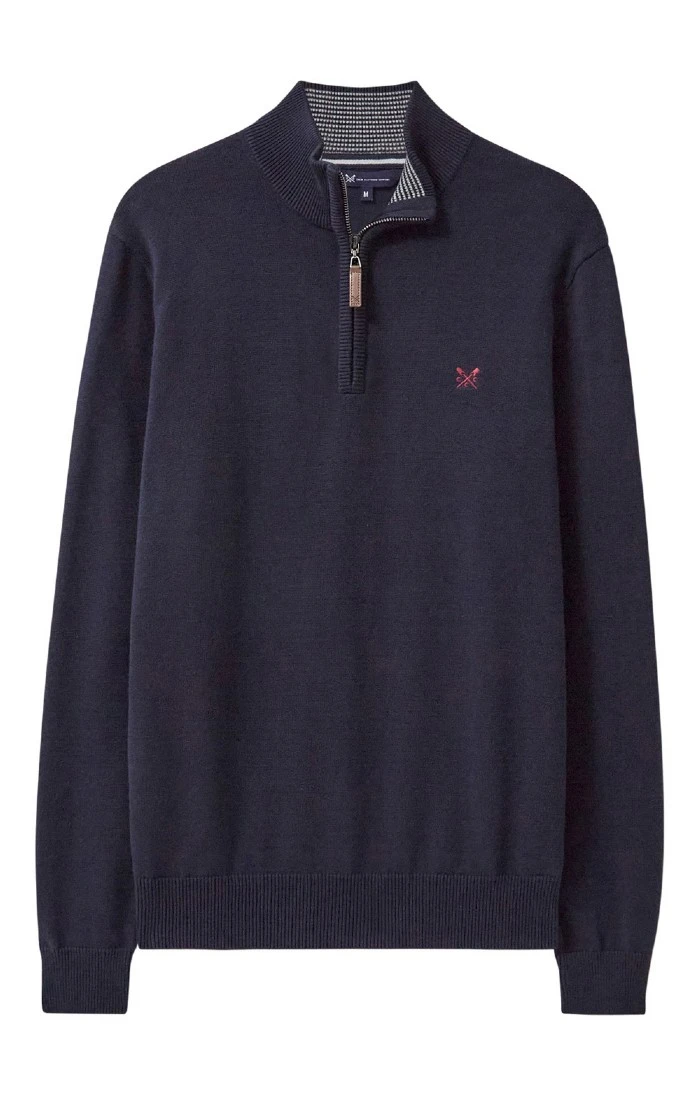 Crafted from premium organic cotton, this contemporary men’s Crew Clothing classic half zip sweater is a wardrobe favourite. The stand-up funnel neck collar features a comfortable ribbed pattern which is matched in the deep hem and cuffs, while added extras including the branded zip pull and the iconic logo in complementary embroidery are delightful finishing touches.