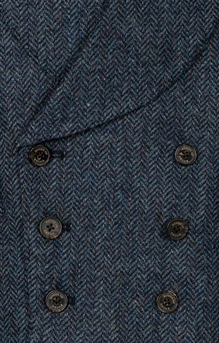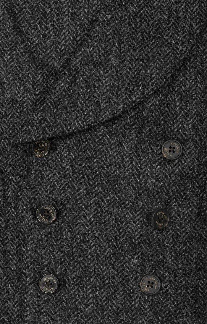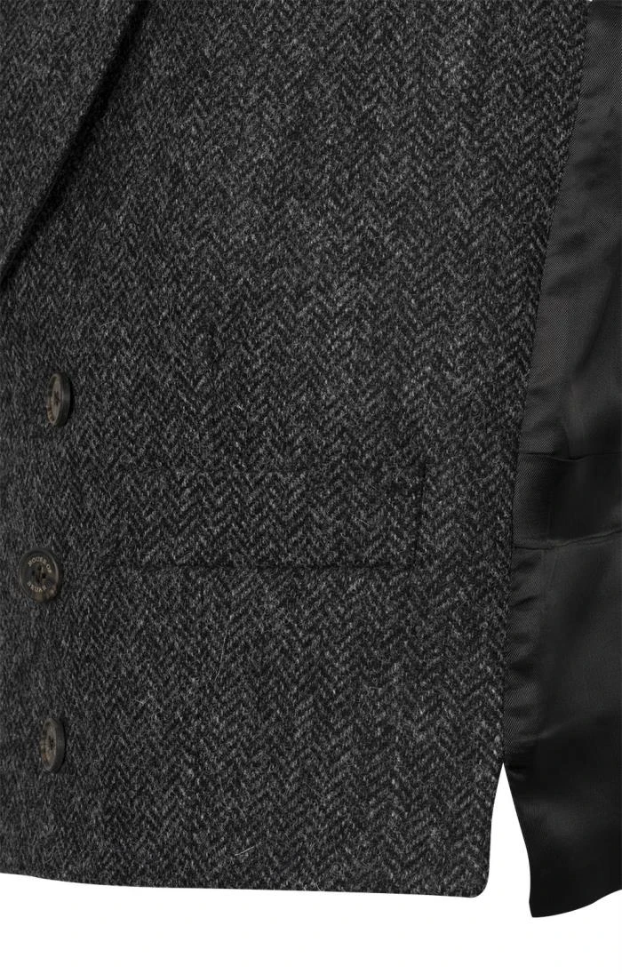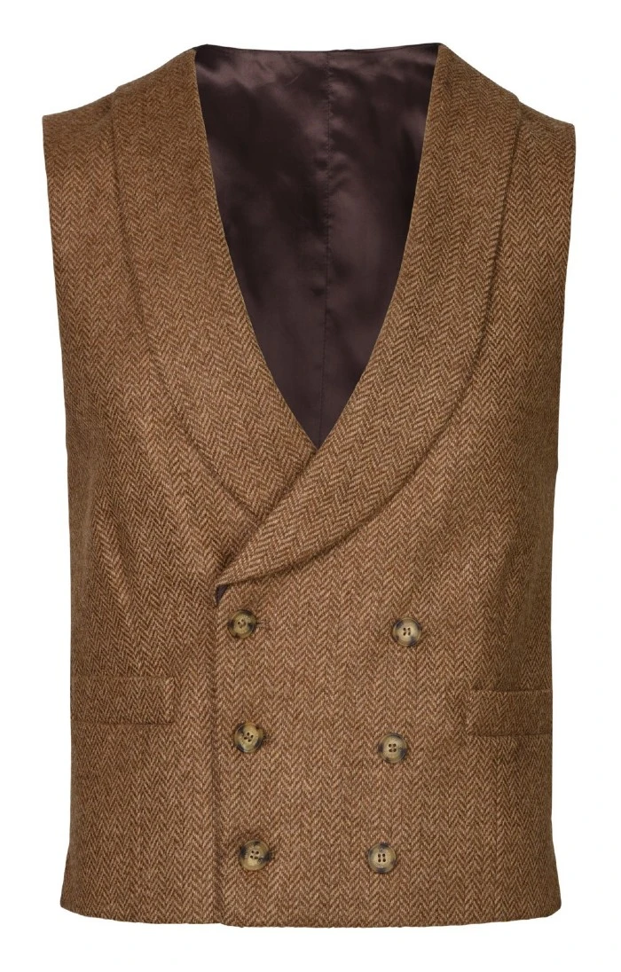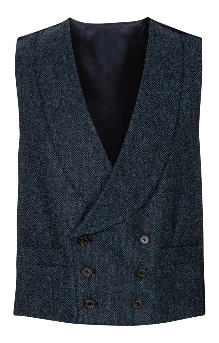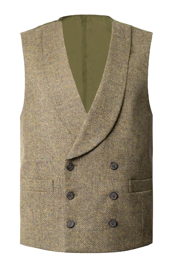 This handsome double breasted British tweed waistcoat features a shawl collar, satin back panel, adjustable waist strap and two side pockets. Made to an immaculately high standard with a quality finish, this sophisticated waistcoat always commands attention.