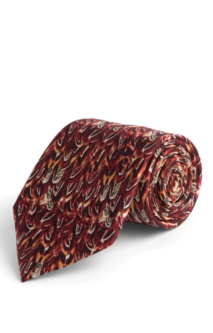 Celebrate the allure of nature this pheasant feathers silk print tie—a refined accessory crafted from meticulously woven silk and hand-finished to perfection. This unique tie showcases an exquisite pheasant-inspired design, featuring the distinctive and unconventional shape of pheasant feathers with a vibrant colour scheme. Suitable for both formal and casual occasions, this tie exudes sophistication while echoing the timeless elegance of pheasant feathers in a stylish manner.
