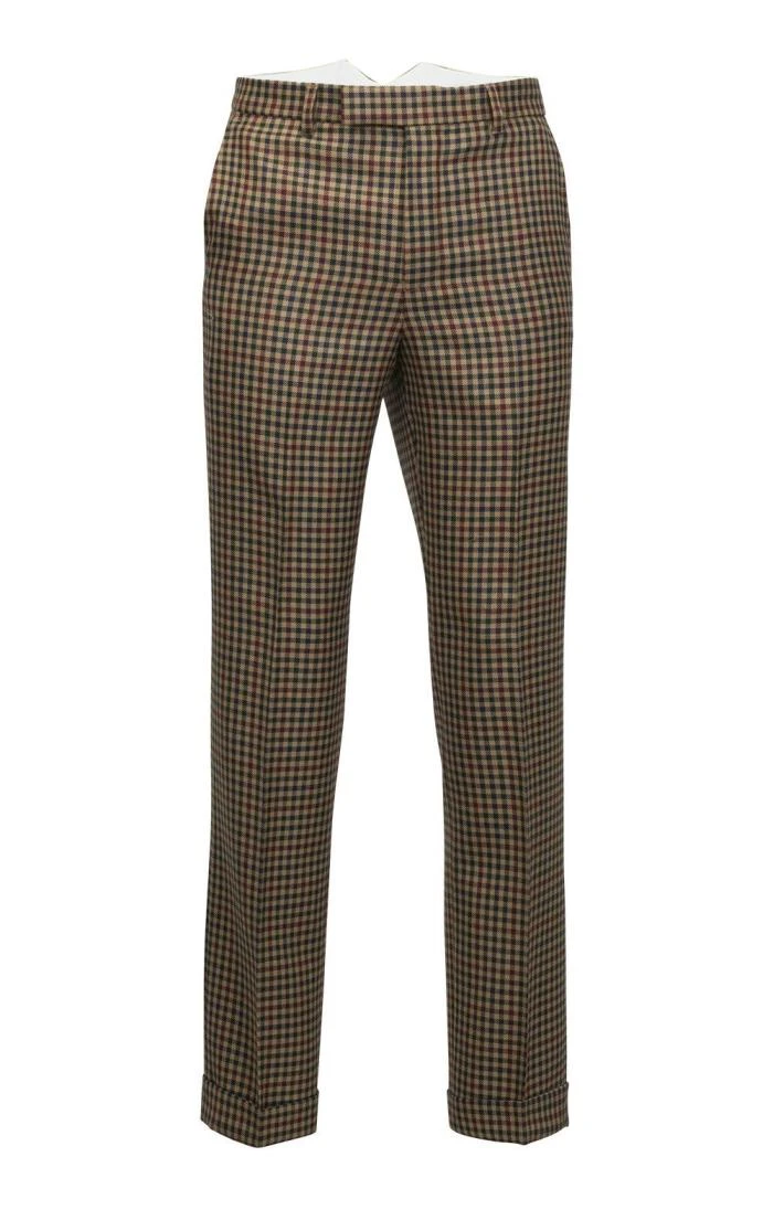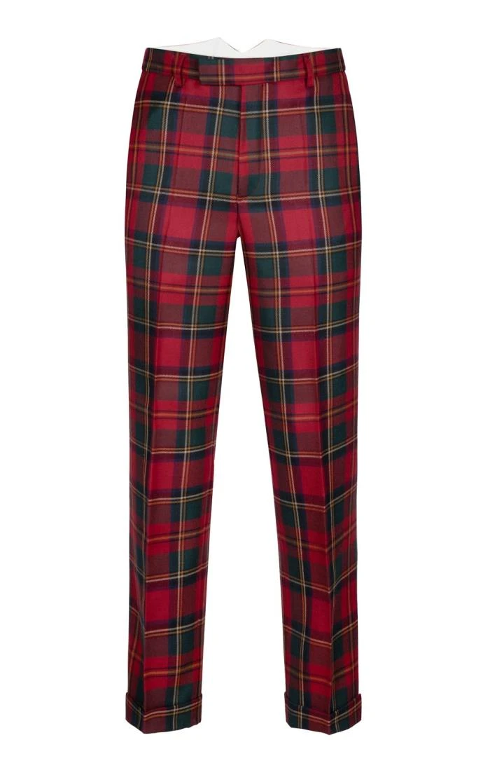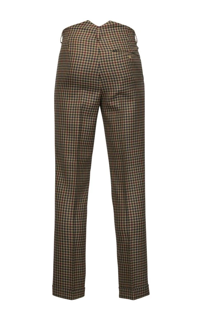 Make a lasting first impression with these traditionally styled plaid trousers in pure new wool worsted cloth and updated with a shaped back belt for wearing with braces. Features a flat front, French bearer, turn-ups and a back hip pocket.