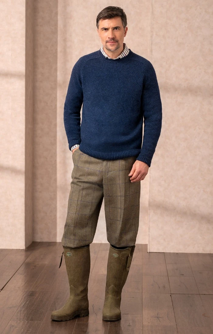 Traditionally cut with back belt, side pockets, a single hip pocket and buckle fastening at the calf, these Saxony tweed plus twos are a time-honoured sporting companion.