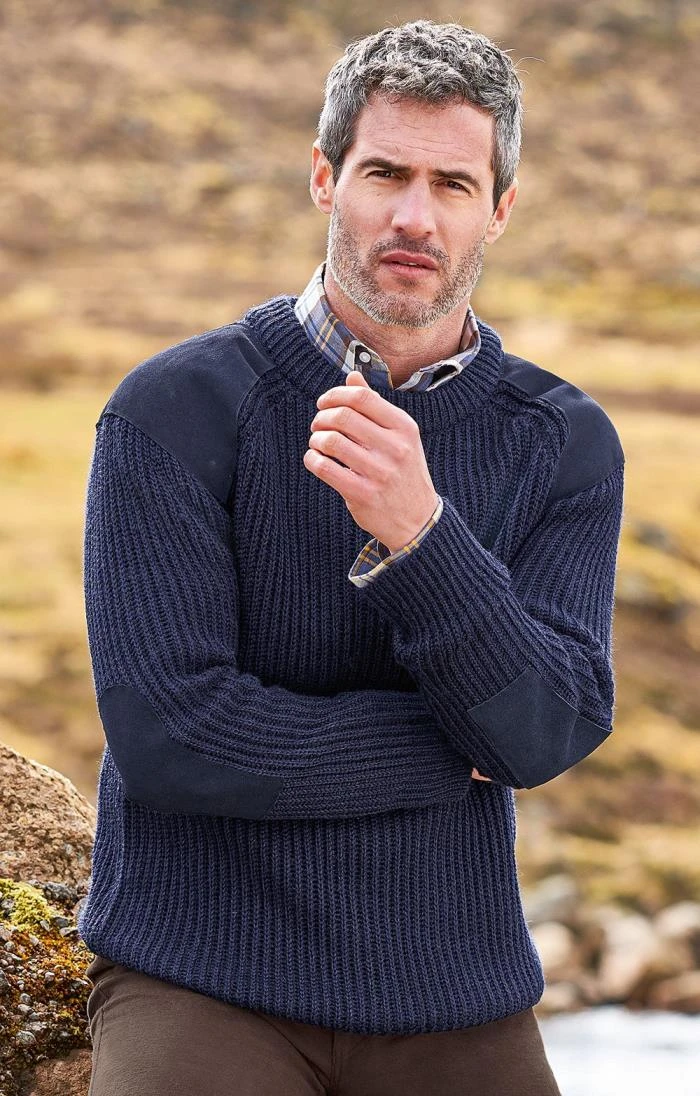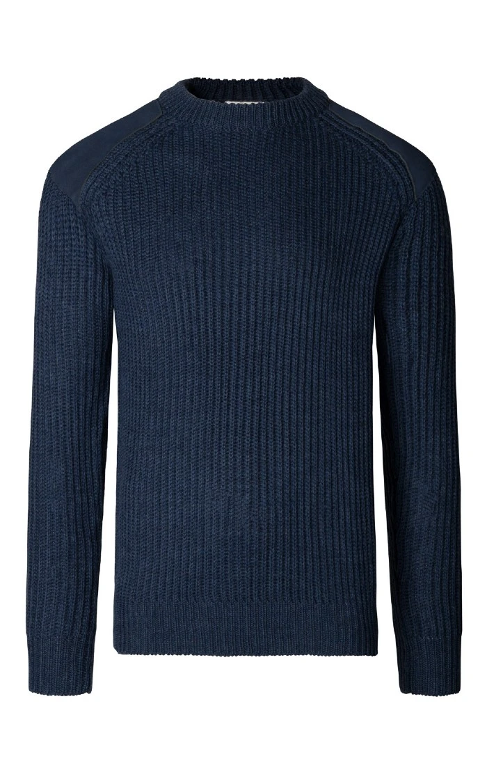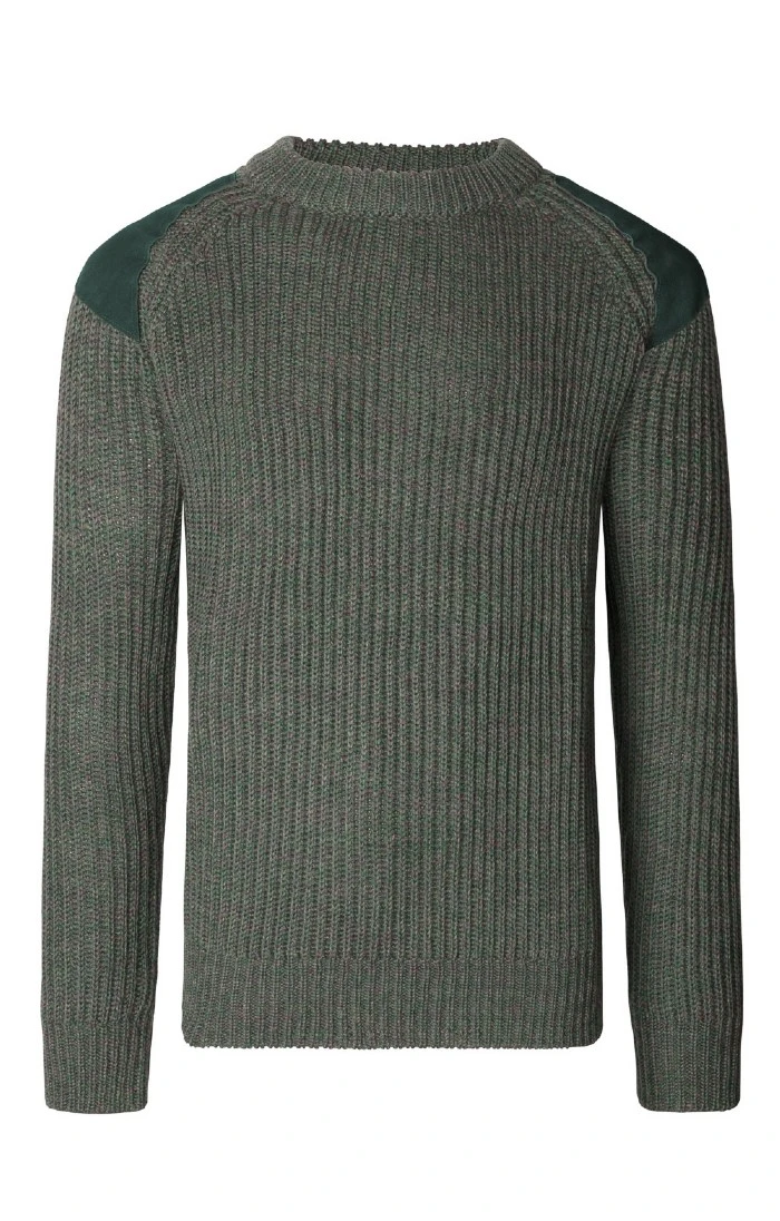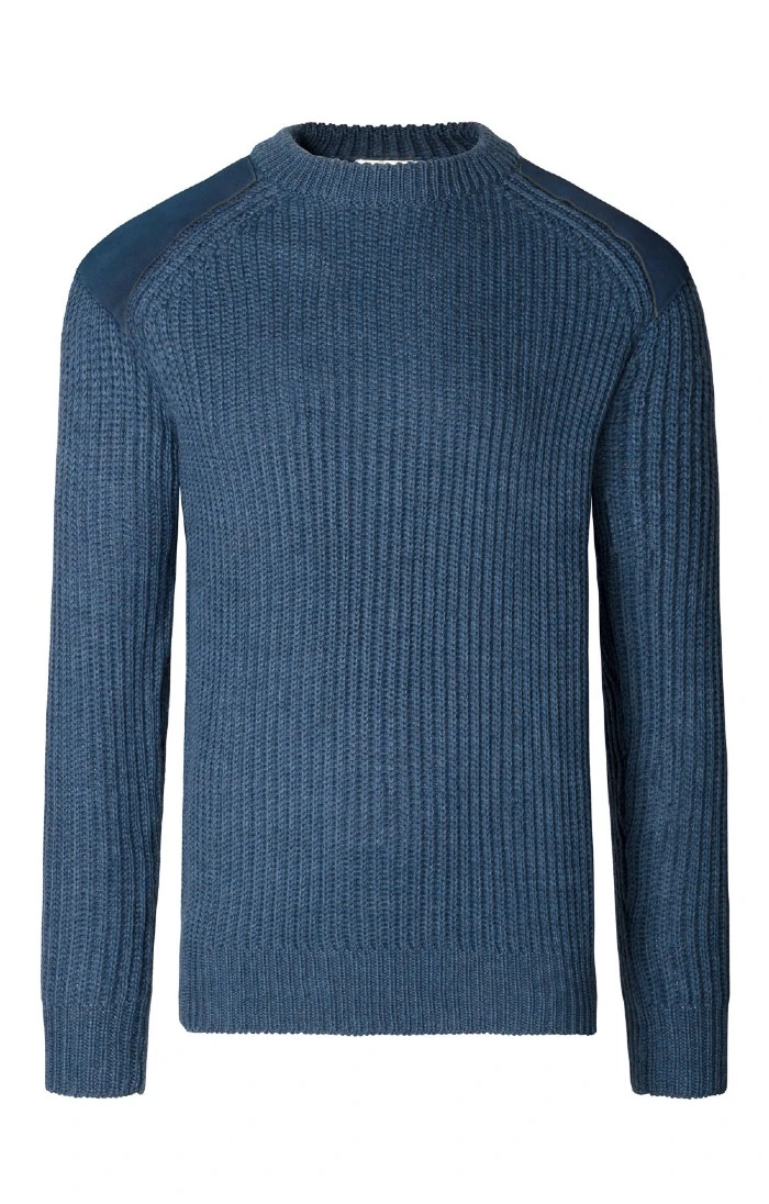 Made in ribbed melange pure new wool for a rich depth of colour, this raglan sleeve jumper is perfect for the colder months. Suede patches at shoulders and elbow provide extra durability just where it’s needed most.