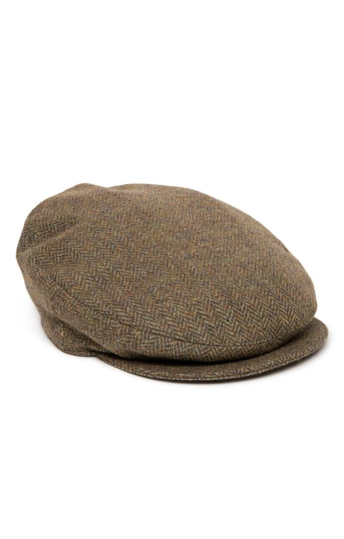 Traditional Edwardian tweed bond cap with concealed stud fastening on peak and satin effect lining.