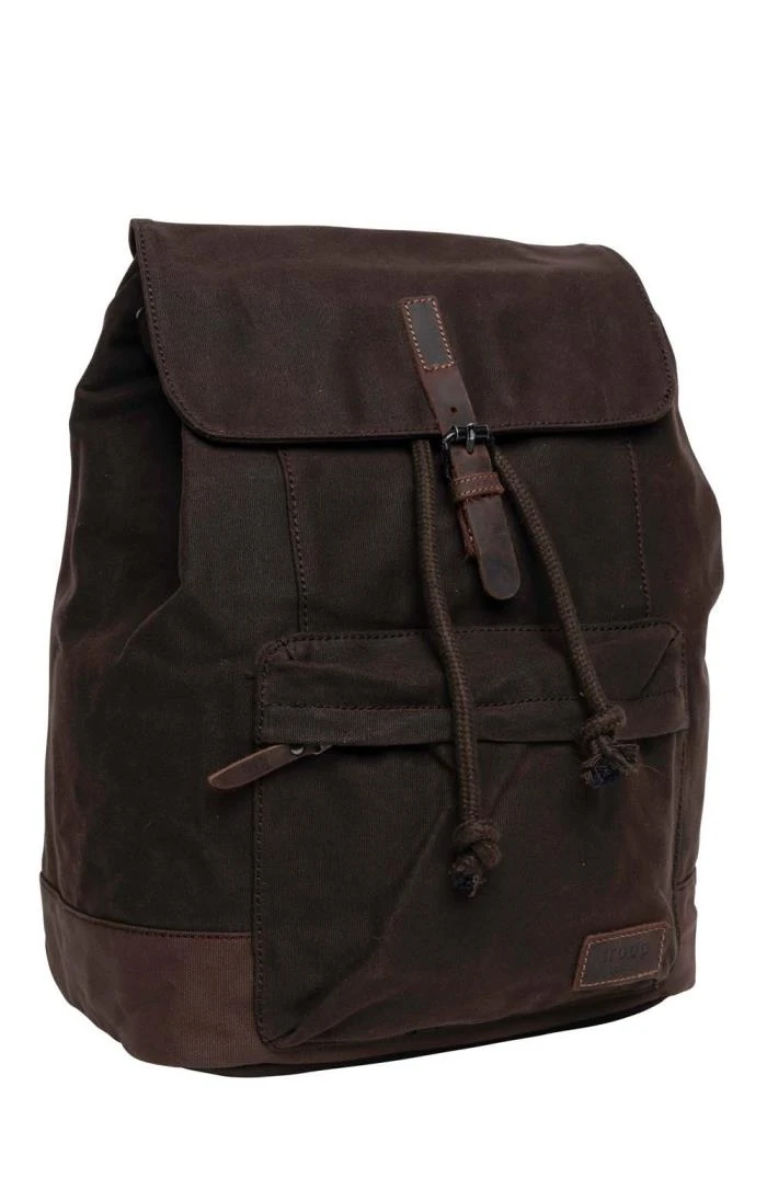 The Troop drawstring waxed backpack is made in premium waxed cotton canvas for maximum weather protection and durability. Genuine leather trims and vintage metal fittings add an air of urban authenticity to this stylish bag, while a padded back panel and adjustable shoulder straps ensure your comfort when you’re on the go. A top carry handle gives added convenience, while a zipped front pouch keeps essentials close to hand. The spacious main compartment is closed with a rope drawstring and secured with a leather stopper, while the top flap closes with a magnetic snap button. The spacious main compartment is lined with a water-resistant monogrammed lining and has a large zip pocket for added security, a phone pouch, open top pocket and a padded laptop compartment (38 x 29 x 3.7cm with fastener tape strap closure at 30cm).
