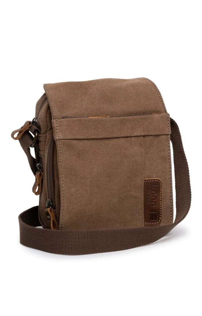 Modern and minimal, the flap over medium cross body bag by Troop London is a sturdy yet stylish canvas shoulder bag equipped with a range of secure sections. The roomy interior compartment is flanked by neatly zipped pockets while the oversized flap lifts to reveal practical slots for pens and phones. Brass and leather trims and Troop London branding deliver a finishing touch of contemporary style and quality.